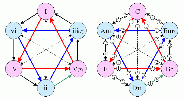 오른쪽 그림은 이 다이어그램을 C장조에 적용한 것입니다. 화음 옆에있는 작은 원의 번호는 화성I(최형덕저)에서 인용한 화음진행의 차수입니다. 그 책에 각 화음간의 진행이 1,2,3,4차로 나누어져 있는데 (1차는 가장 잘 쓰이는 진행... 4차는 가장 덜 쓰이는 진행) 화살표의 방향과 관계없이 그 화음으로부터 진행되어 나아가는 차수를 가리킵니다. 예를들면 F에서 C로의 진행은 2차입니다.