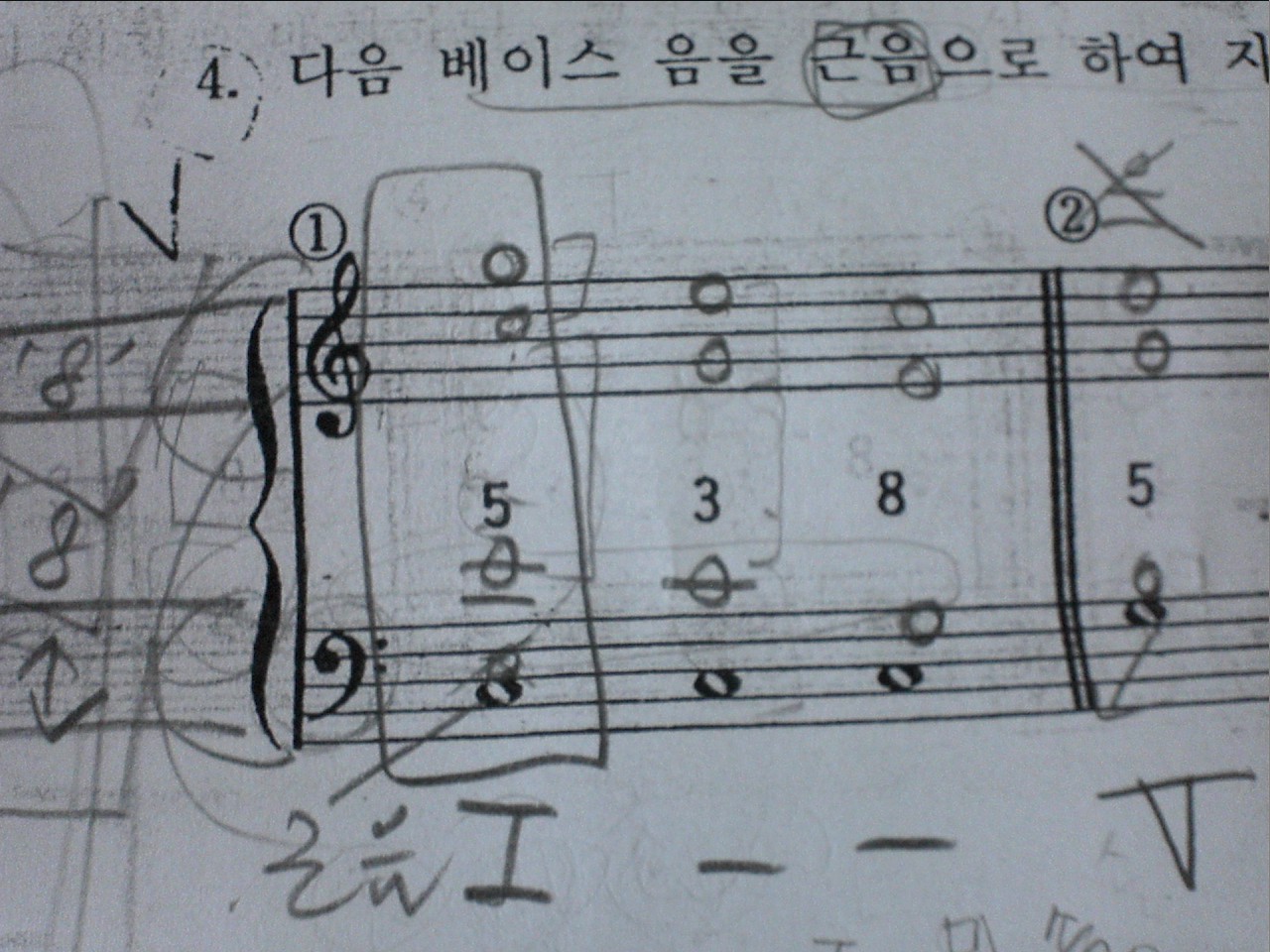 아..문제는요 베이스 음을 근음으로 하여 지시된 음 위치를 개리 위치로 배치하되. 근음을 중복하시오 입니다