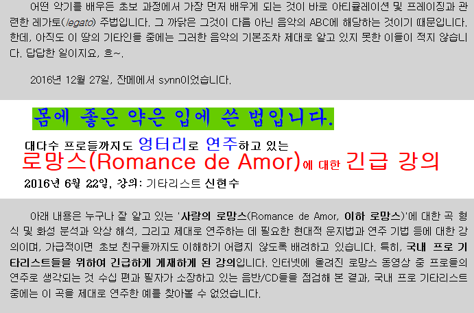 URL은 매니아의 "음악이야기" 난의 <대다수 프로들도 되지 않고 있는 legato 연주가 가능하기 위해서는…>이라는 글의 댓글 중에서 캡춰했습니다.