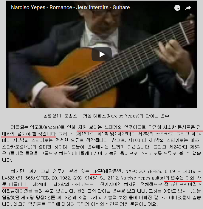 보인다는 내용이네요. 그리고 이어서 예페스의 (라이브) 연주상의 오류를 하나하나 분석해 밝혀 나가시네요.