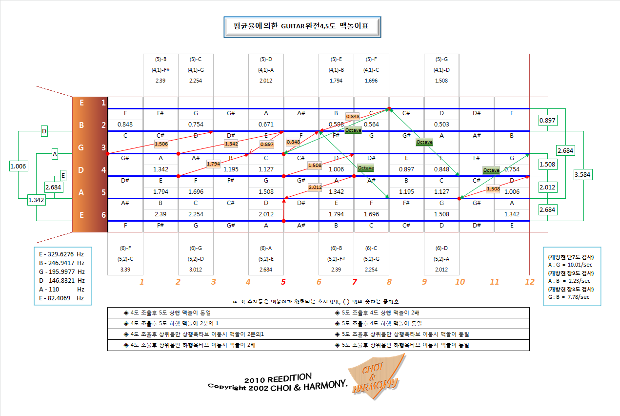 하여튼 이 번 bluejay 님 글을 보고 오래전에 만들어 두었던 기타 맥놀이 조율표를 올려봅니다.