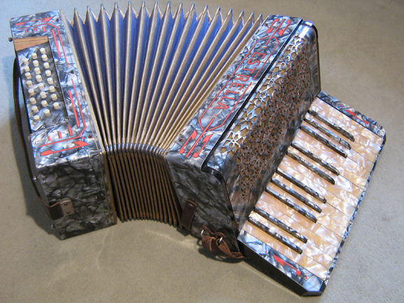 왼쪽에 있는 버튼과는 그 수도 모양도 상당히 다르지만, 전체적인 형태와 원리는 현재의 아코디온과 같다고 할 수 있습니다.