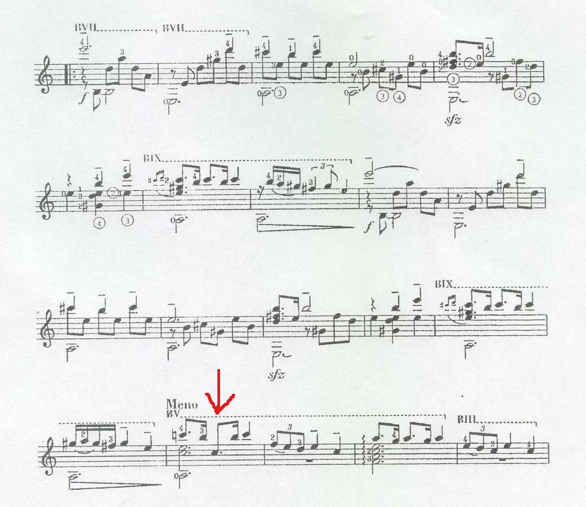 여기 기타 매니아 자료실에 있던 악보를 가지고 연습을 하는데... 첨부한 그림에 빨간 화살표 부분의 음표가... 과연 맞는 건가요? 별로 어색하진 않은데, 녹음된 연주들을 들으면 이 음이 아닌 것 같아서요... 부디 무지한 중생을 구도해주시어요. ^^;;;;