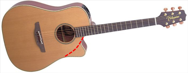 아래 그림에서 보는 바와 같이, 울림통 연장선이 cutaway 부분에 와서는 내부 점선을 따라 감추어진 것을 말하는 것입니다. 말하자면 바깥쪽 cutaway 부분은 덧 댄 판이 되는 셈이지요. 이때 원래 cutaway와는 그 울림이 어떻게 다른지 궁금해서 질문하는 것입니다.