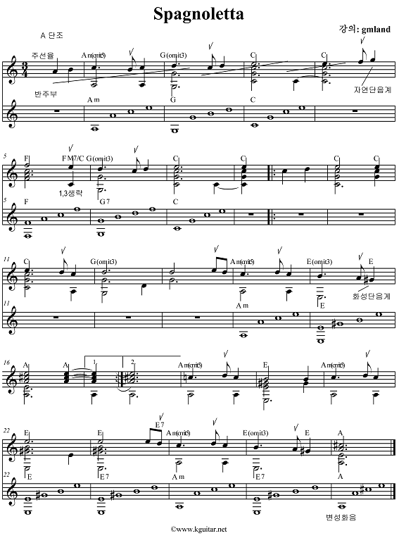 ‘Spagnoletta’는 외성인 Soprano 성부에 주선율이 배치되어있고, 역시 외성인 Bass 및 내성(Alto 및 Tenor)은 반주화음/장식화음으로 되어있다. 이와 같이 기악에서는 보통 주선율이 소프라노에 배치되며, 클래식 기타음악 소품은 대개 주선율 및 반주화음/장식화음으로 구성되는데, Guitar는 음역이 좁고 운지제한이 크며, 양손이 일체가 되는 구조임으로 인해, 양손으로 각각을 연주할 수 있는 건반악기처럼 주선율 및 부선율과 반주화음을 함께 표현하기 어렵기 때문이다.