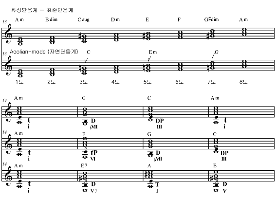 표준단음계인 화성단음계는 ‘Mode/선법’(보조음계)으로 취급되는 Aeolian-mode(자연단음계) 및 Dorian/Ionian-mode(선율단음계)와 종종 함께 사용되며, 그 음계화음도 공유한다.